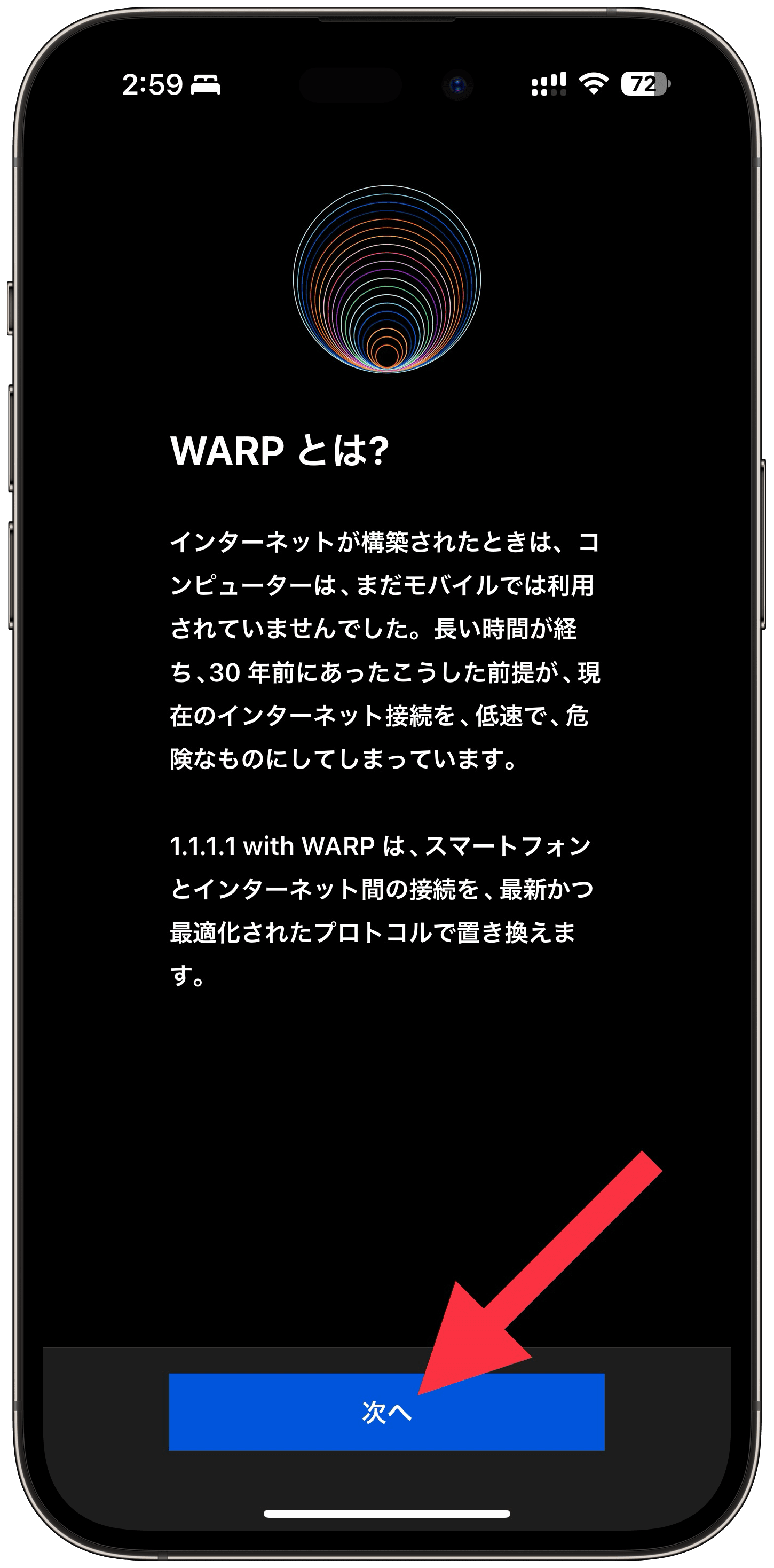 起動すると、WARPの説明が表示されますので「次へ」をタップします。