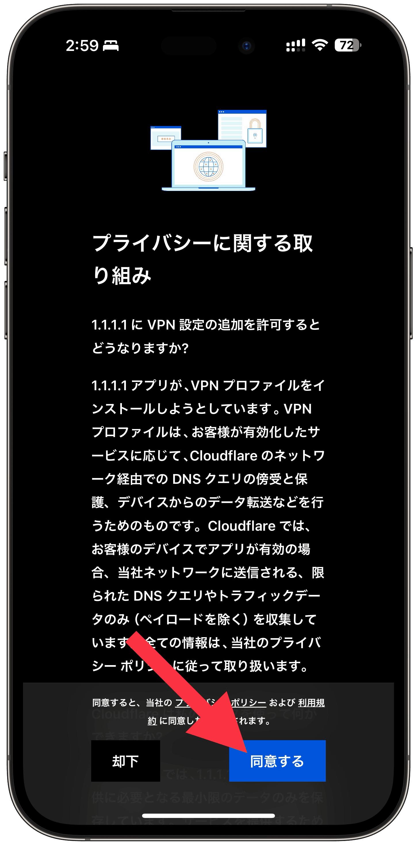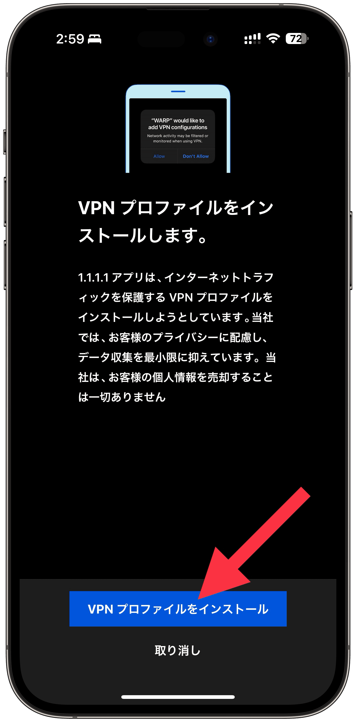 続いて、「1.1.1.1」を使用するのに必要なVPNプロファイルをインストールします。