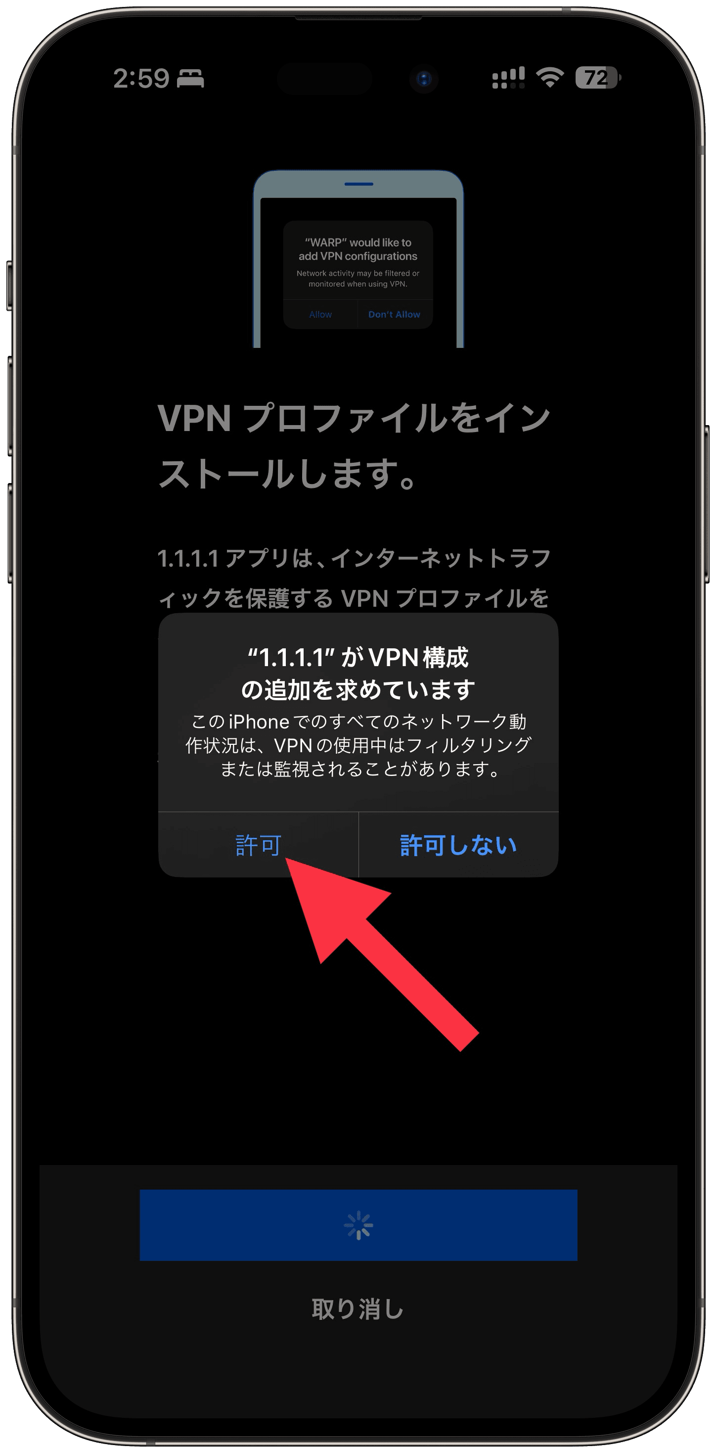 「VPNプロファイルをインストール」をタップして「許可」をタップします。