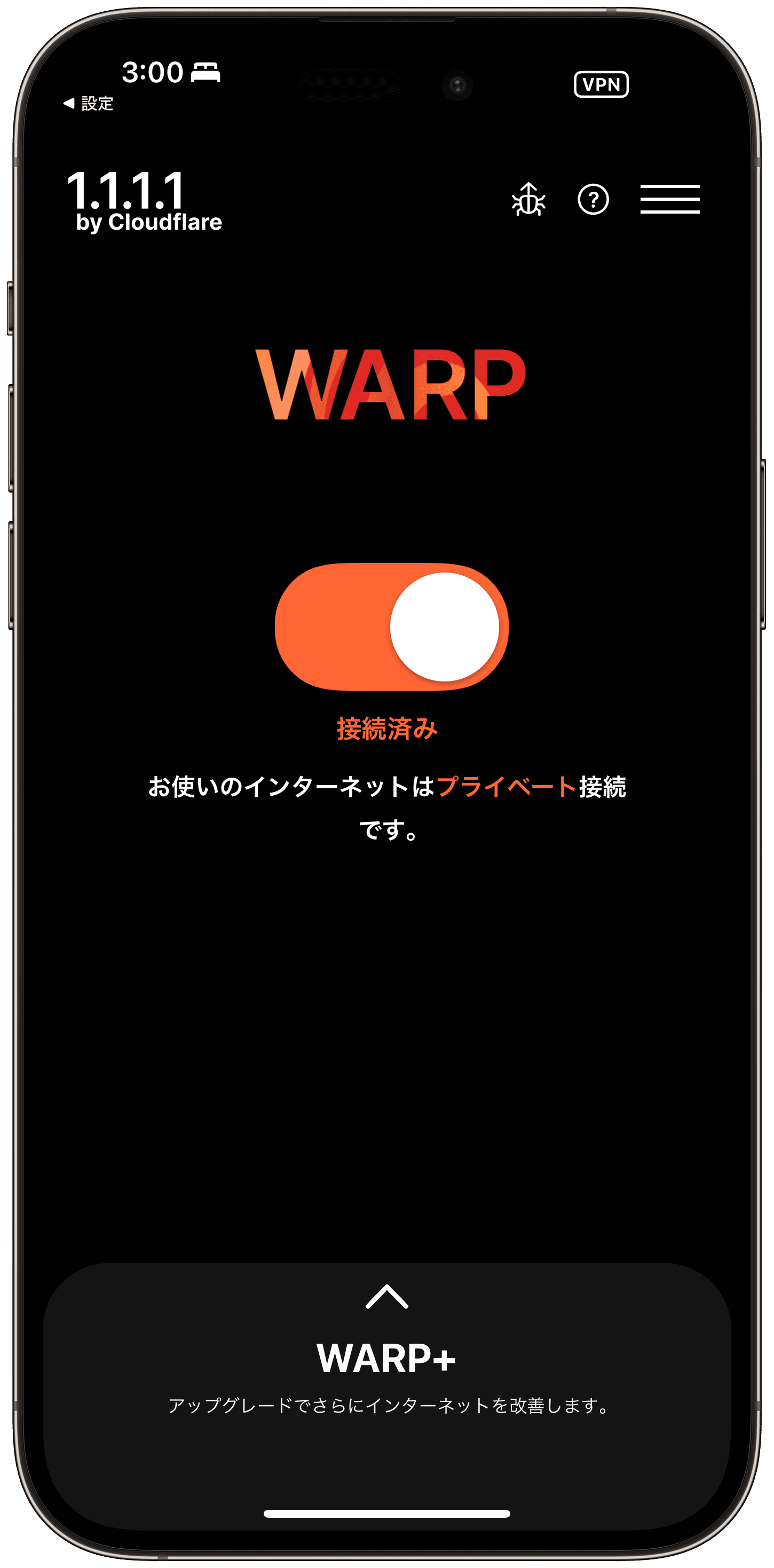 WARPの下にあるスイッチをオンにして、「接続解除済み」が「接続済み」になったら完了です。